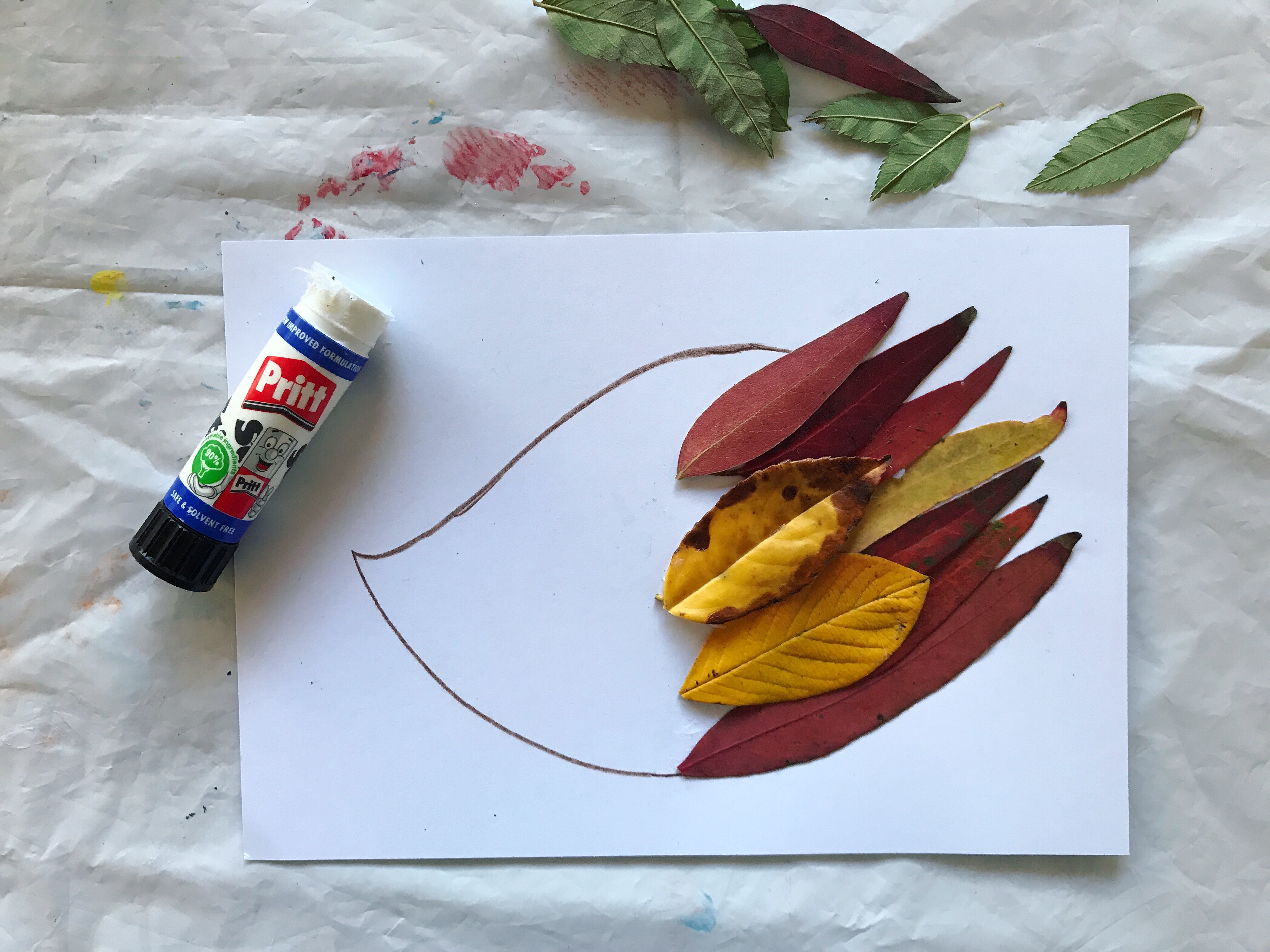 Once you’ve finished sticking on the leaves, use the pencils to draw in any other remaining features. As you can (hopefully) tell, I was making a hedgehog with the leaves as the spines, and then drew in the nose, eyes, mouth and feet.