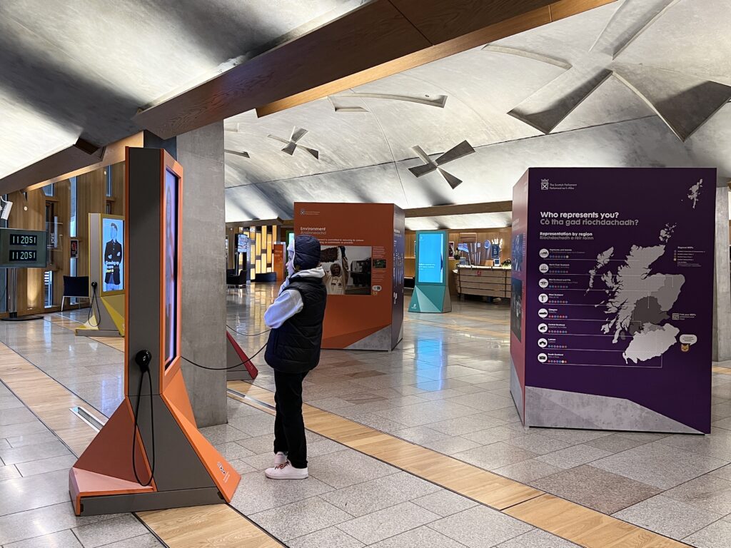 The exhibition begins with a display in the Main Hall, which explains how the Parliament works, what the different constituencies and committees are, and what devolved powers Scotland has.