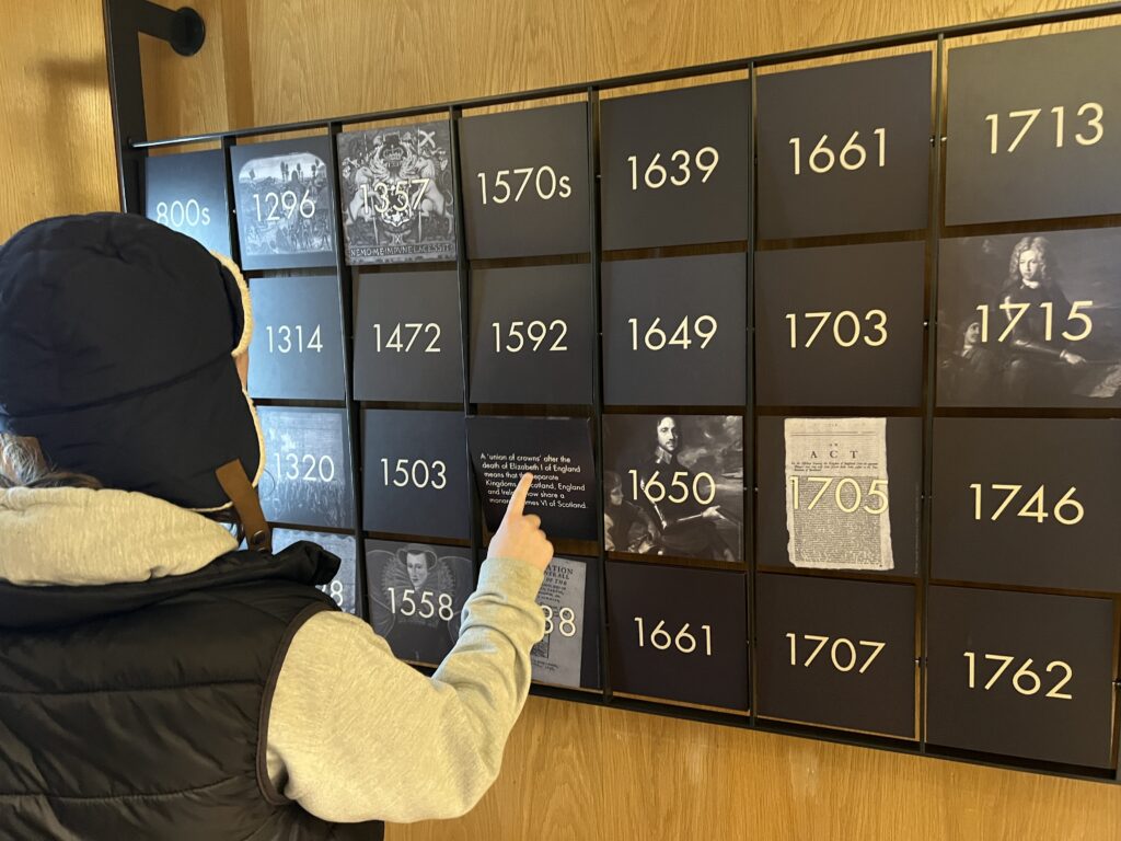 The display included big video touch screens, where you can listen to people talking about different subjects such as the Ban on Smoking, Growing Up in Care, LGBT+ Equality , Land Reform, or British Sign Language. The boys were quite interested in these. Each subject had a timeline and a video testimonial, and they listened to quite a few of them.
