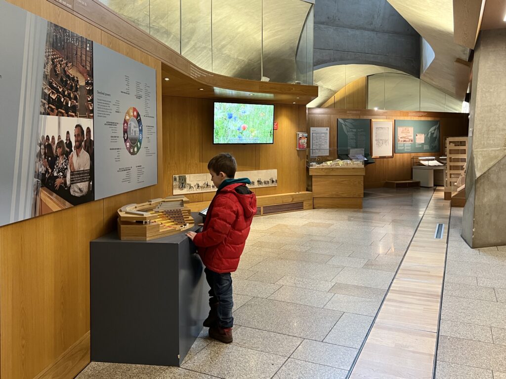 The exhibition continues in the exhibition gallery space, where you can learn more about the history of the Parliament and its building, including a model of the debating chambers, an interactive timeline, and a tactile exhibit about the architecture of the building and the different shapes you can find in the architecture.