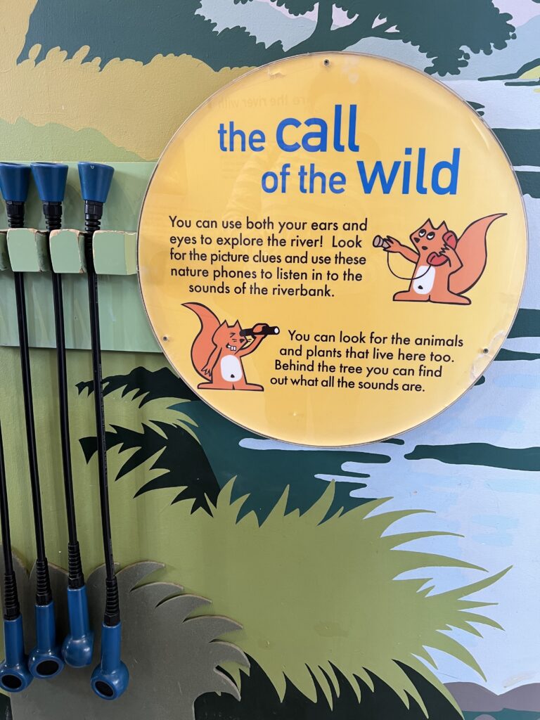 There’s also the Call of the Wild Wall. Grab one of the nature phones, line them up with the right spots on the mural, and listen for the sights and sounds of the river bank.