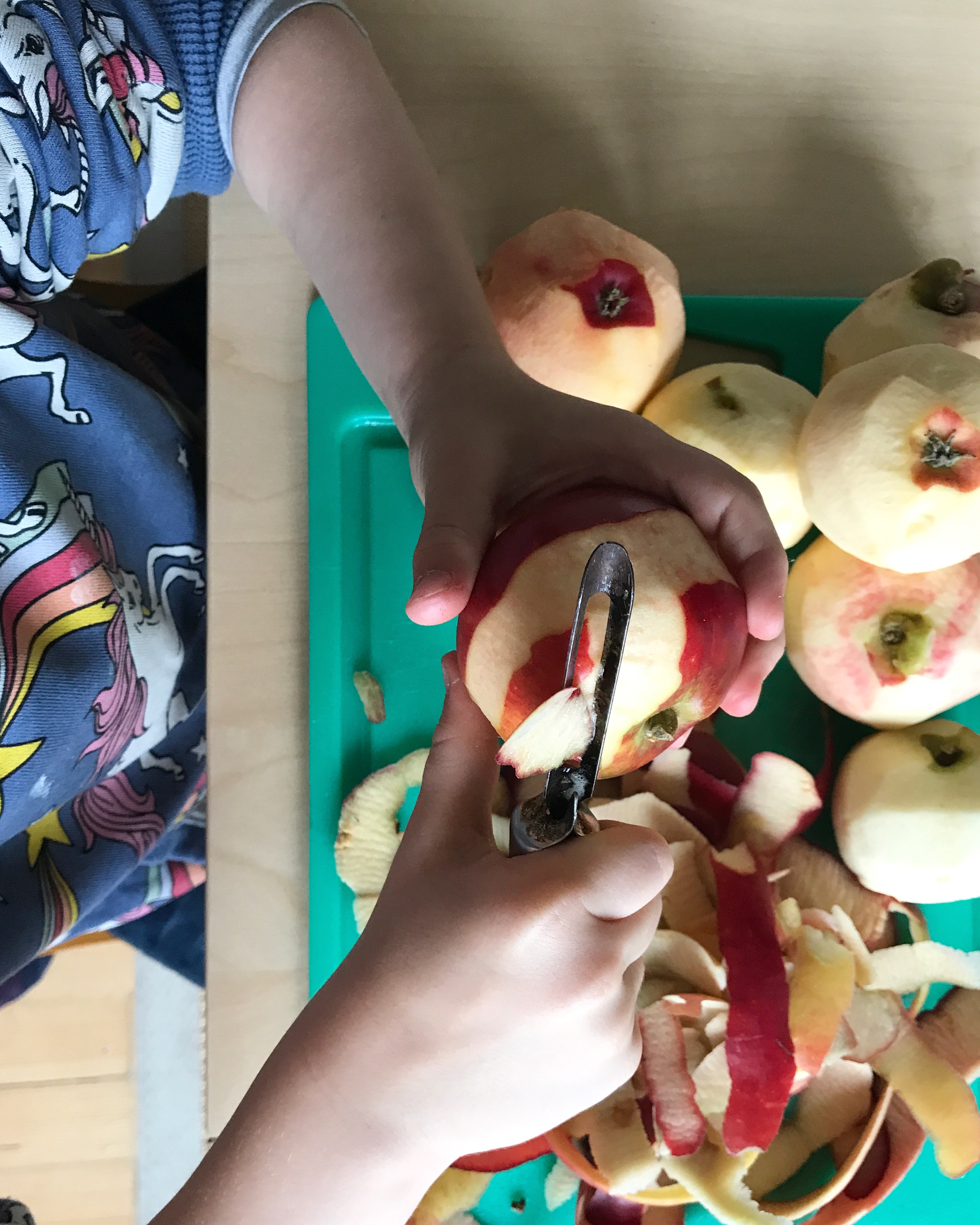 The kids had so much fun helping me to make this cake. They’ve helped before to measure out and mix ingredients for a cake, but then it’s always just been a case of pouring the batter in a tin and sticking it in the oven. Somehow, the extra job of preparing the topping made it all the more exciting. Oskar, in particular, was adamant he wanted to help peel the apples. So he received an induction in to using an apple peeler, and very carefully (and very slowly!) peeled his first ever apple. He even managed not to slice off any of his thumb. He literally said, and I quote, “This is so exciting! I’m peeling an apple for the first time!” Makes you wonder why we bother with toys, lol.