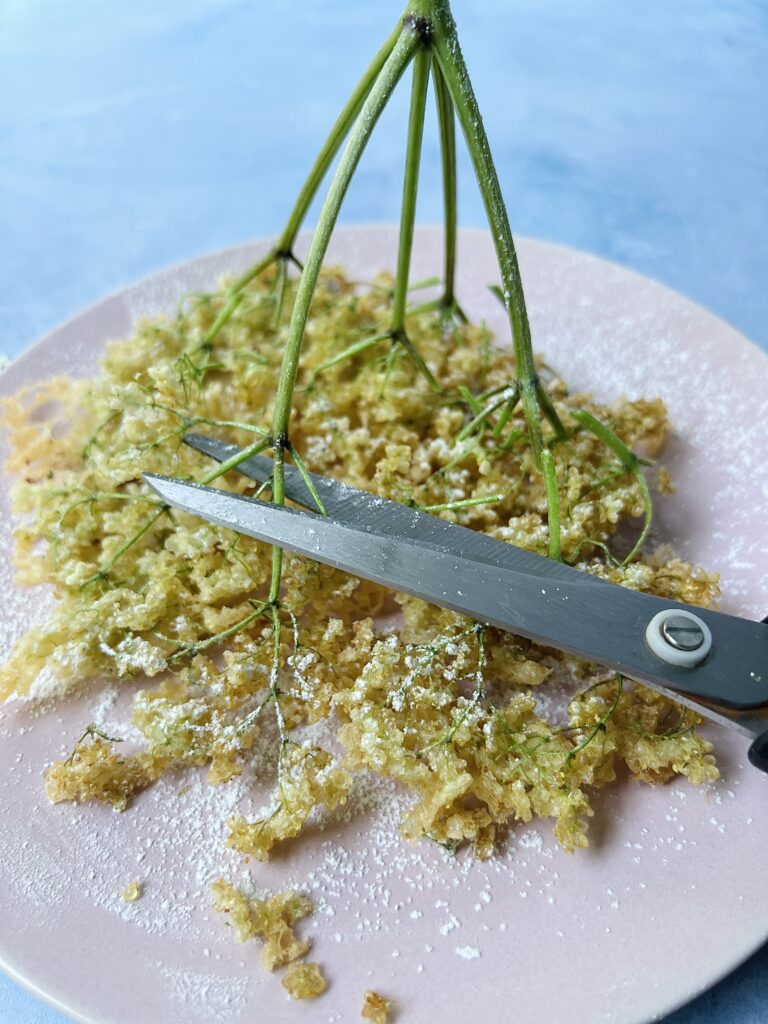 - 2-3 large elderflower heads, freshly picked (leave at least 1 inch of stem to handle them by)