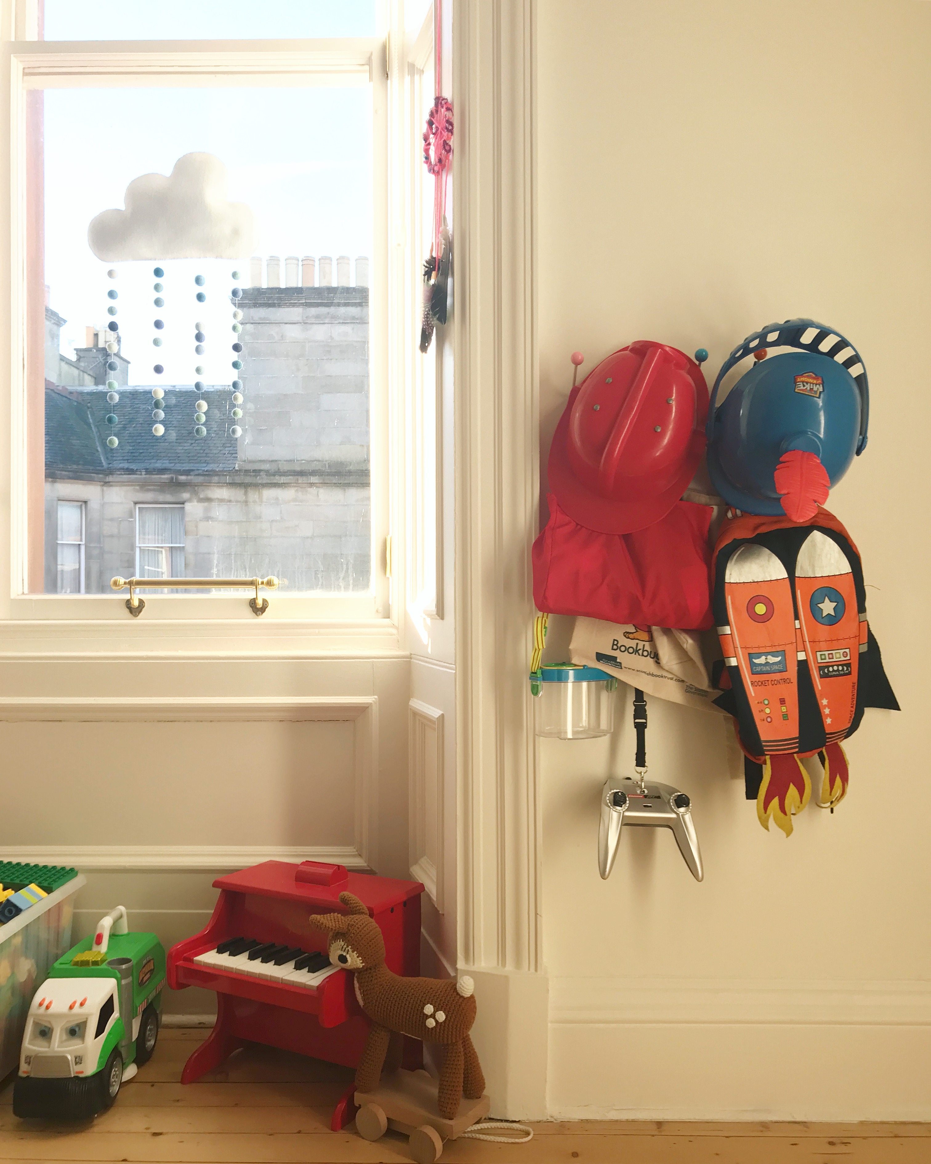 In our last place, the boys had two shared rooms between them – a smaller bedroom and a larger playroom – but since we moved from a three bedroom to a two bedroom apartment that’s about a third smaller than before, we’ve had to squeeze all their stuff in to one room. The eagle-eyed among you, who remember the boys’ old playroom from pics on Instagram and our feature on Design Mom, may be asking themselves what happened to their play kitchen and their tee-pee? Fear not, the tee-pee found a home in the living room, and the play kitchen sits in our actual kitchen, so we can now cook side by side!