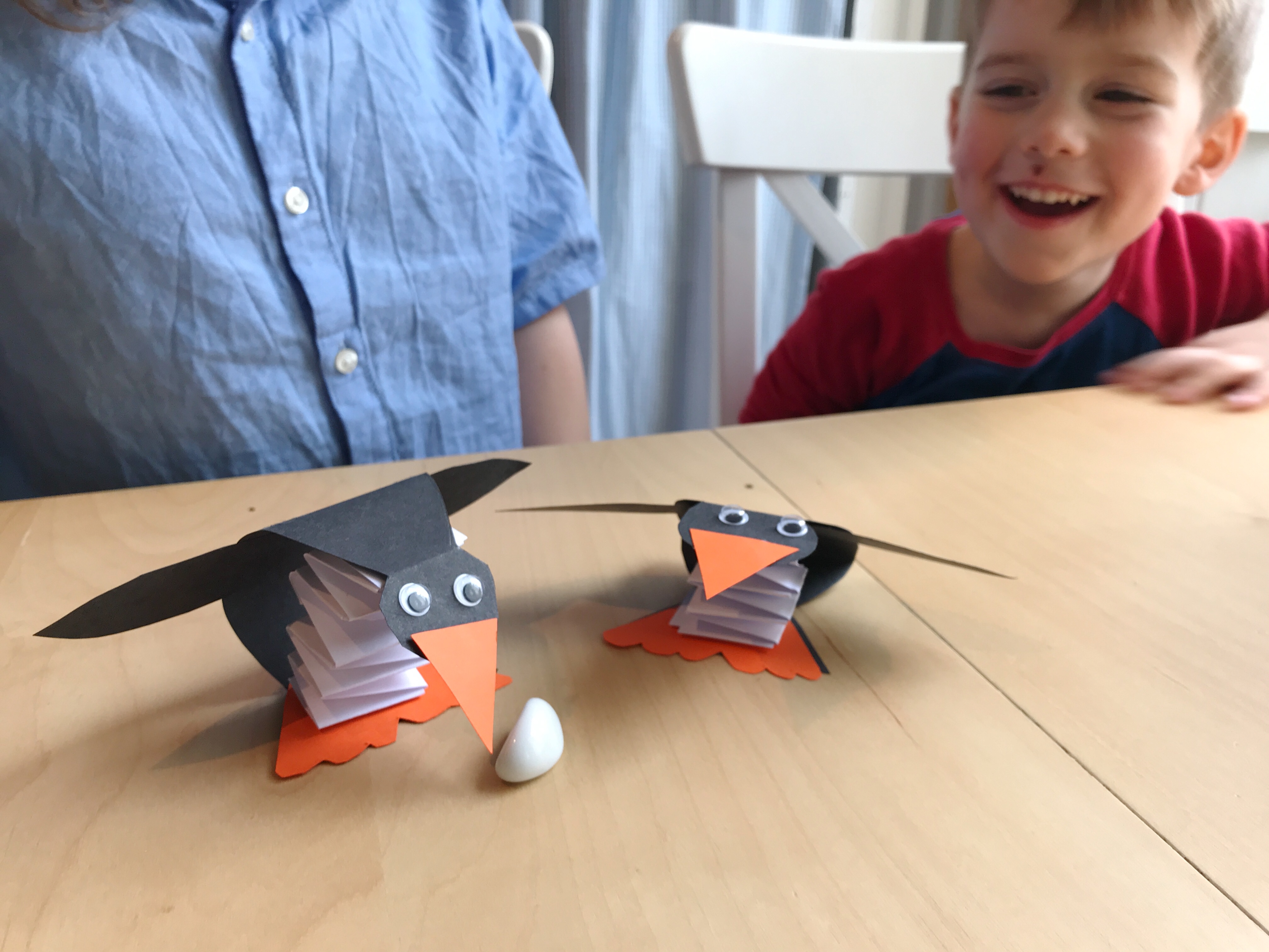 I had to help my 4 year old a little with the cutting and glueing, but my 8 year old managed very well on his own. Half an hour later, we had two cute penguins being bounced around the kitchen table. We learned some interesting facts about penguins too, in the little instruction booklet that comes with the box.